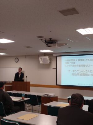 令和7年度 LPガス機器需要開発セミナーを開催しました 投稿日: 2025年11月27日 投稿者: editor1 令和7年11月26日(水)かしはら万葉ホール(橿原市)において 令和7年度LPガス機器需要開発セミナーを開催しました。 本年度のセミナーは、39名の方が参加されました。 プログラム ≪第一部≫「ライフライン防災」電気・ガス・水のバックアップのご提案 講師:Ⅰ・T・O株式会社 営業三部 大阪支社 マネージャー 寺田 宗平 様 ≪第二部≫カーボンニュートラルに向けた「高効率給湯機の推進」 講師:一般社団法人 日本ガス石油機器工業会 ガス機器需要促進委員会委員 長谷川 智哉 様